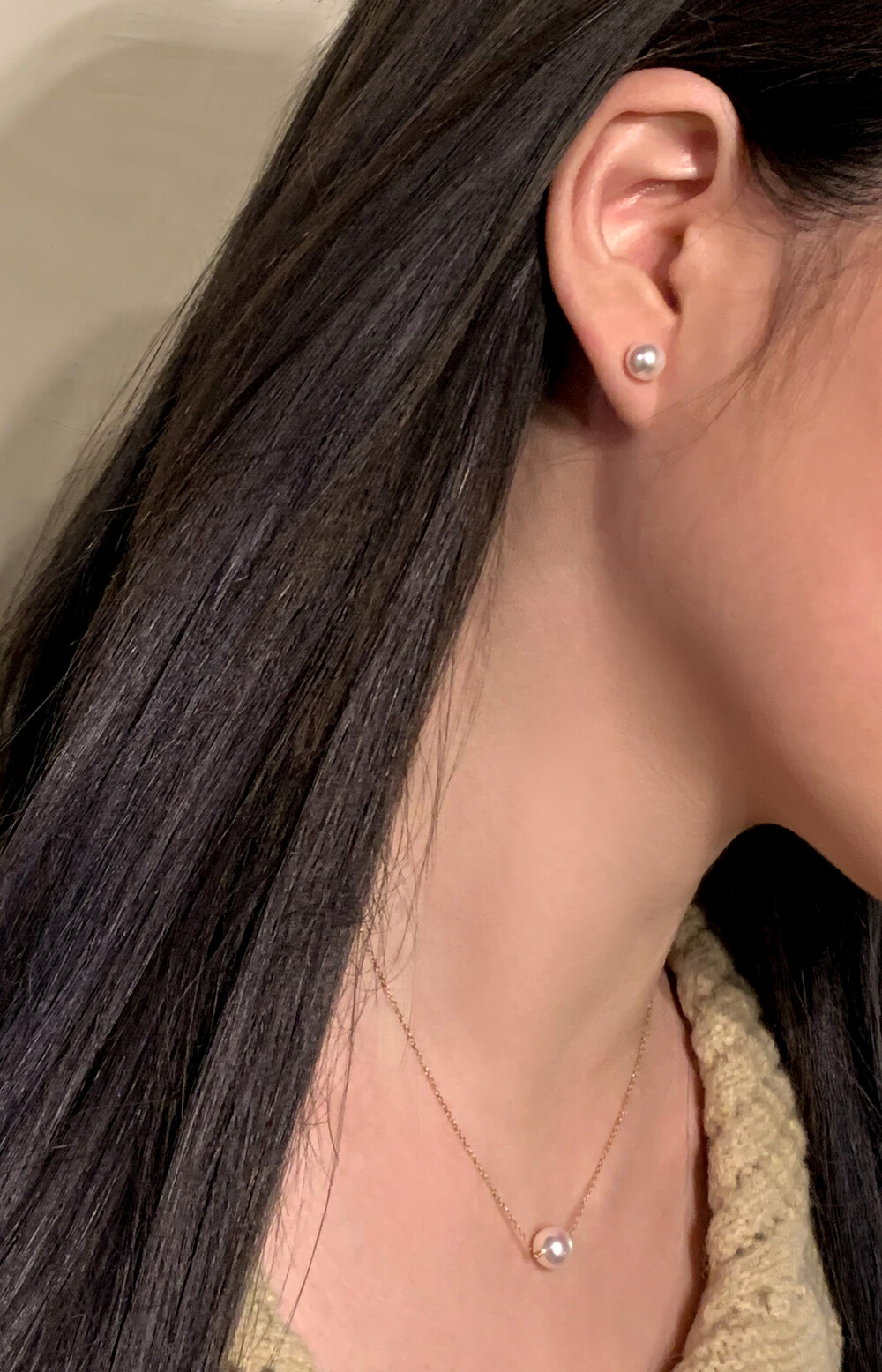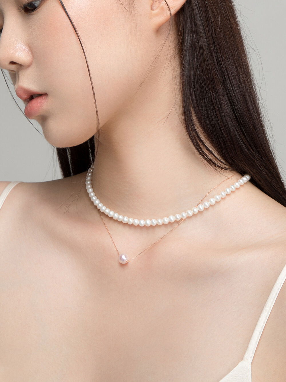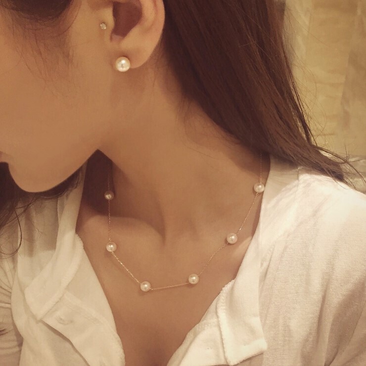 진주 한알 네크리스 (8mm) + 진주 비드 네크리스 착용